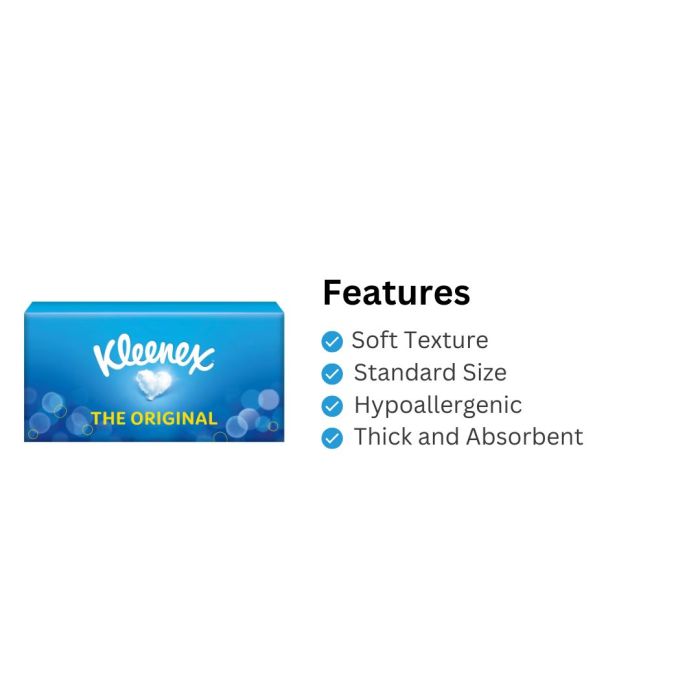 The classic, dependable tissues come in a stylish and compact box that fits easily into any room or space. Ideal for wiping hands, faces, or dealing with sneezes and spills, Kleenex Original keeps you prepared wherever you are.